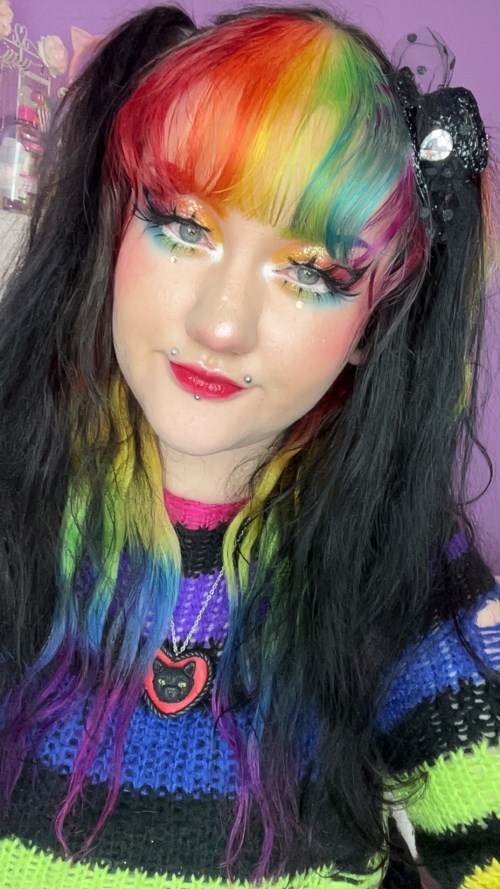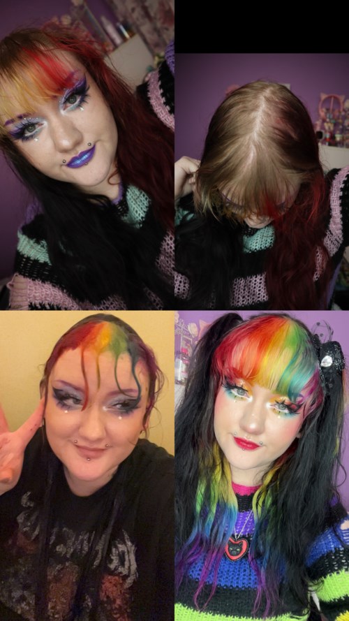 Das Make-up und die Haare von gestern für als ich in Värnamo während der Live-Karussell spielen sollte ~ Ich habe die Gelegenheit genutzt, meine Haare vorher zu färben, habe den Regenbogen aufgefüllt, die Seite gefärbt, die zuvor rot-schwarz war, und auch ein wenig Extensions gefärbt, damit ich mehr Farbe bekommen konnte!🌈✨ Ich habe Directions verwendet und das Lila mit Cerise und Lagoon Blue gemischt (habe vorher Violet verwendet, aber das will kaum haften und geht sofort wieder raus) Es war auch internationaler Huttag, also hatte ich einen Minihut, da ein größerer Hut sich umständlich anfühlte, wenn ich die Gitarre halten und spielen und singen sollte cx Ich war in letzter Zeit so deprimiert, aber ich fühle mich immer ein bisschen mehr wie ich selbst, wenn ich gerade meine Haare gefärbt habe, und hoffentlich hält die positive Energie von gestern an, da ich riesigen Spaß hatte!💖21 products in post 🌈💖 - Rolle des Benutzers: Lyko Creator.Der Beitrag wurde 1 Monat erstellt