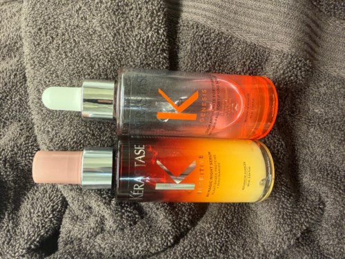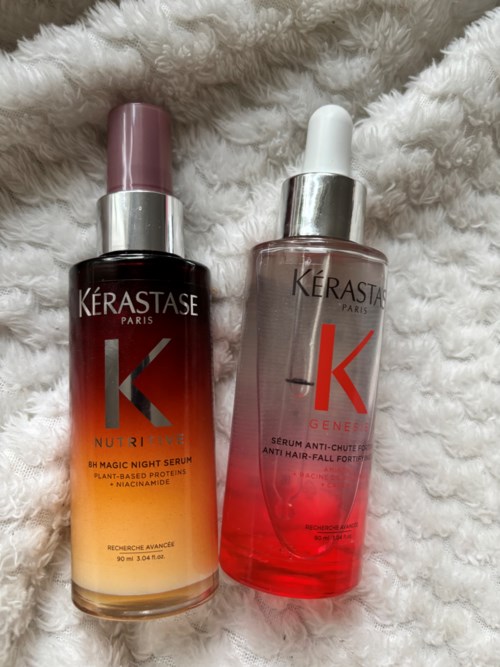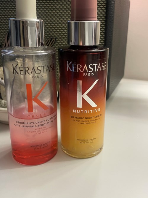 #lykotestpilot #kerastase I have been testing these products for 5 weeks, and I am super satisfied. Genesis Serum Anti Chute Fortifiant: Wow, that's all I can say🩷 ⭐️My hair feels thicker after the first use. ⭐️My scalp has improved. ⭐️“Baby” hairs have started to grow. ⭐️The scent is lovely. ⭐️My hair stays nice and doesn't get greasy as quickly. A bit of a high price tag, but well worth the money, I will continue to buy🩷 Nutritive 8H Overnight Serum: ⭐️Smells good. ⭐️My hair becomes soft and smooth. I do feel that this product weighs my fine hair down a bit, otherwise it does its job.1 product in post Genesis Serum Anti Chute Fortifiant & Nutritive 8H Overnight Serum99 views - The post was made 1 dayRating: 3 out of 5