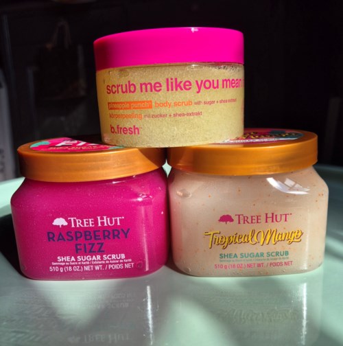 Newly purchased body scrubs. Tree hut is my favorite brand when it comes to scrubs. A mango scrub and a raspberry that I'm most curious about. B.fresh is new to me, a pineapple scrub, I've had a pineapple 🍍 from Tree hut, which I like. The jar from B.fresh raised eyebrows at the thought that the bottom is like a bowl. #lyko #lykoreview #skincare #treehut #bfresh3 products in post Body scrubs