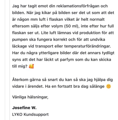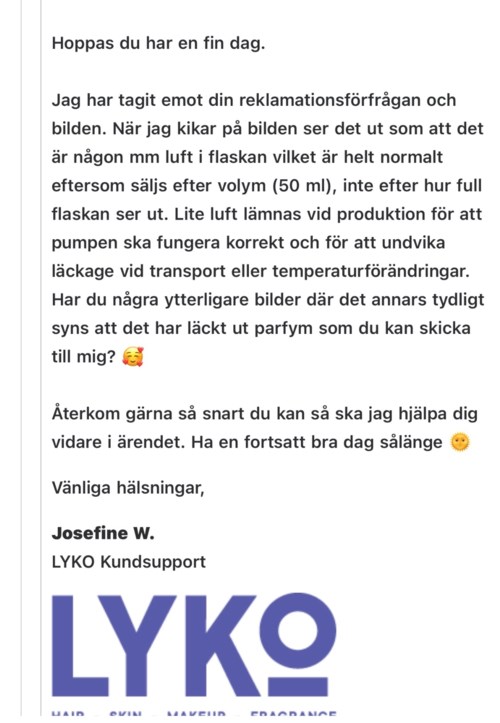 Missing 26% of the content and it is not 50 ml And look at their response, they really don't want to do right by themselves and more importantly for them to drag out responding to multiple messages at first which frustrates me, and come with statements that it is supposed to look like that in two messages and in a chat conversation, and then basically question me by asking for proof.