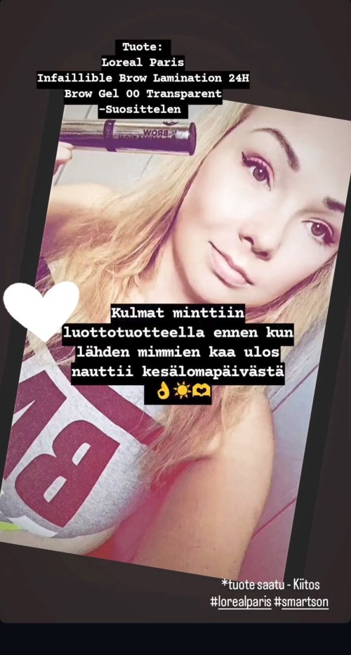 Tää on kyllä huipputuote kuumanakin kesäpäivänä. Parhaiten toimii tuuheille kulmille (toisin kuin omani) & pidin tuotteen harjasta. Jos jotain pitäisi muuttaa, niin ehkä aavistuksen tuotteen koostumus voisi olla erilainen. *Olen osallistunut Smartsonin testaajana tuotteen kokeiluun ja tuote on saatu. #smartson #lorealparis1 product in post Loreal Paris Infaillible Brow Lamination 24 h Brow gel 00 Transparent.4565 näyttöä- Käyttäjän rooli: Lykon asiakaspalvelu .Kommentti lisättiin 1 vuotta sittenMoikka! 💕 Ihanaa kuulla, että tuote on ollut mieluinen. Haluan ehdottomasti kokeilla tätä itsekin! 😍 Ihanaa maanantaita! ❤️🌞