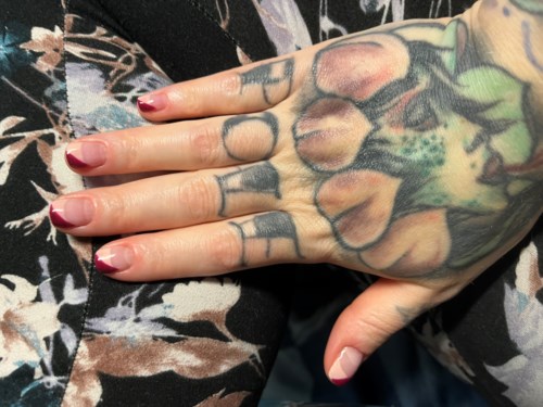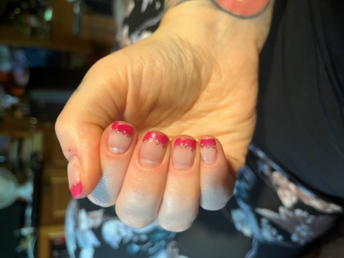 - Kommentti lisättiin 2 vuotta sittenTässä vielä samat kynnet kaksi viikkoa vanhana. Olen kevyesti viilaamalla lyhentänyt kynsiä hieman. Kahden viikon kohdalla näkyy pari kuplaa etusormen lakan alareunassa, samoin toisen käden nimettömässä. Jos haluaisi, ne voisi korjata viilaamalla varovasti reunaa, ja laittamalla tipan kynsiliimaa - jos irronnutta reunaa on vain vähän, se imeytyy reunan alle. Koska kuitenkin vaihdan lakan tällä viikolla, en näitä pieniä kupruja enää korjaa.
