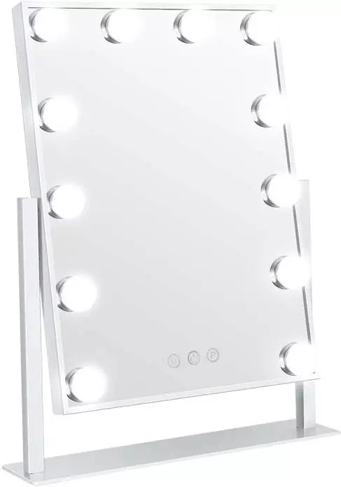 Suuri valkoinen meikkipeili, jossa on 12 tehokasta LED-valoa, joita voit ohjata kosketustoiminnolla. Valossa on 3 eri sävyä, ja kosketustoiminnolla voit säätää kirkkauden juuri sopivaksi. Peiliä voi kääntää 360 astetta.