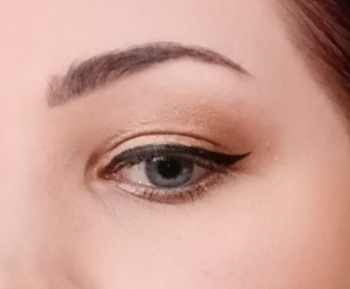 (Kuvassa tuotetta on vain alaluomella.) Sävy on harmahtava ja levittyvyys on huono. Kynä on erittäin kova, eikä tartu helposti. Kerrostaessa kynä levittyy ja toimii hyvin smoky eye -lopputulokseen. Sotkee helposti.405 näyttöä