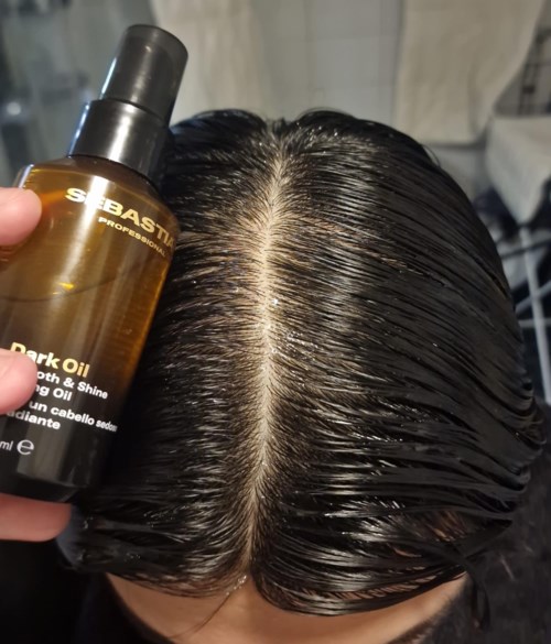 For glatt og glansfullt hår, fordel 1-2 pump med Sebastian Dark Oil i lengdene og spissene i fuktig eller tørt hår før du styler som ønsket.