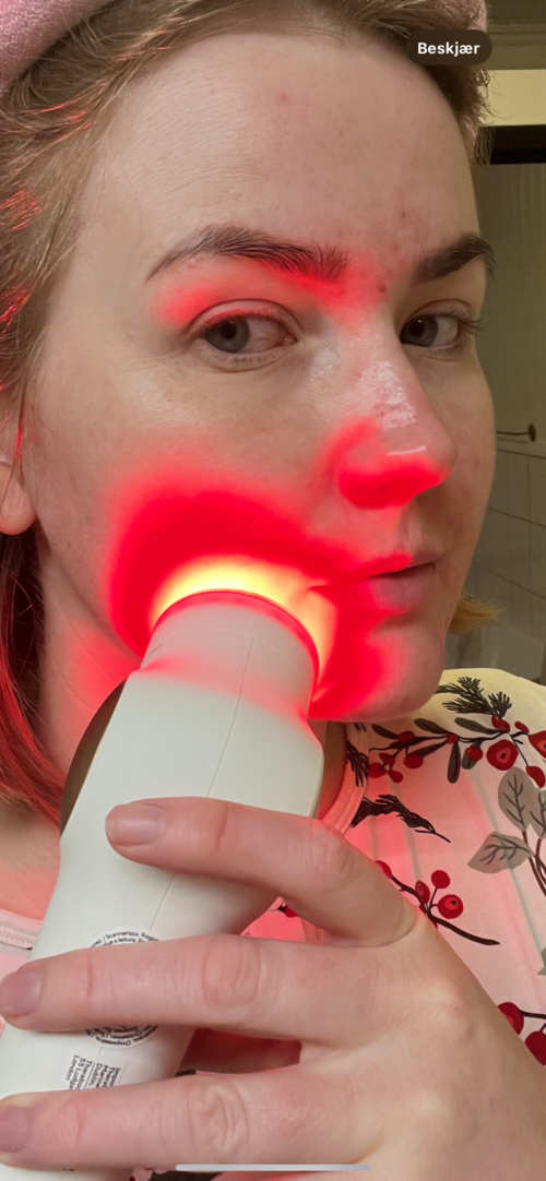 Var så heldig å få tilsendt denne for å teste den ut som #LYKOINFLUTESTER 🥰 Jeg er 33år, har kombinert og sensitiv hud. Og har fått litt linjer rundt munnen og rundt øynene. Har også linjer på halsen jeg har veldig lyst til å få strammet opp. Da jeg mottok denne gikk jeg inn på Therabody sin egen nettside for å se på instruksjonsvideoene. Ligger veldig godt forklarte videoer der om de forskjellige bruksområdene og “hodene”. Apparatet er veldig lett å skjønne etter å ha sett videoene. Det sterke LED lyset starter ikke å lyse ordentlig før apparatet er så nært huden den skal være. Så man trenger ikke å tenke på at man blir blendet når man skrur på lysterapien. Den gir deg også beskjed hvert 15 sekunder, ved ett lite pip når du er ferdig med ett område i ansiktet, for at du skal flytte apparatet til neste plass i ansiktet. De funksjonene jeg bruker mest er nok Mikrostrømterapien (hodet med de 2 kulene) med gel’en som følger med 😃 Bruker nivå 3 selv. Starter på halsen og jobber meg oppover halsen, til kjeven, ansiktet og til slutt pannen. Du kjenner innimellom en litt prikkete/støtlignende følelse på hudne når du drar kulene over huden. Men ikke vondt. Drar også alltid apparatet i rettningen mot punkter der jeg har lymfeknuter - som mot ørene eller mot lymfeknutene på siden av halsen. Fordi jeg ønsker å drenere lymfeknutene. Mikrostrømenheter fungerer ved å gi små en elektriskestøt til muskler og hudceller. Støtene skal bygge opp muskler i ansiktet, løfte og stramme opp huden. Jeg merker stor forskjell på ansiktet mitt etter bruk 👏🏻 Spesielt om jeg bruker den på morgenen når jeg er litt hoven i ansiktet. Får drenert vekk mye vann fra ansiktet og virkelig formet kontruene i ansiktet mitt. Se bildet der jeg har brukt den kun på den ene siden av ansiktet mitt, hvor stor forskjell det her 😳 Man ser at jeg har fått drenert mye vann fra den siden av ansiktet! Så var det LED ringen med lysterapi! 😍 Noen kan nok synes at det er litt tiltak å måtte flytte apparatet selv over hele ansiktet mens man får lysterapi. Men om du bruker “Rød + Infrarød lys” sammen med massasjedelen slik at du masserer ansiktet samtidig som du får lysterapi, er det så verdt det! 🥹 Det røde lyset skal hjelpe å redusere linjer og øke kollagen produksjonen, mens det infrarøde lyset er er smertelindrende ved muskelsmerter. Jeg sliter veldig med muskelsmerter i kjeven fordi jeg er veldig anspent. Og dette apparatet er helt fantastisk for å avspenne musklene i ansiktet og redusere smerter ❤️ Bruker å gå over hele ansiktet med det flate massasjehodet + LED ringen med rød+infrarødt lys over hele ansiktet først for å få en lett massasje og god blodsirkulering. Før jeg bytter til massasjehodet med en spiss for å gi meg selv litt triggerpunkt massasje med lysterapi samtidig på punkter i ansiktet som trenger det. Se videoen jeg la ved 🥰 Så går jeg over med blå lysterapi i hele ansiktet uten massasjehode. Som skal hjelpe å redusere mild til moderat acne. Har ikke merket stor forskjell på akkurat dette ennå. Da jeg ikke sliter så mye med acne. Men bruker fordeom, for å forebygge 😄 Det følger også med et rensehode, for å bruke sammen med en rens. Har ikke brukt den så mye fordi de andre stegene tar litt tid, så velger jeg som regel bort rensingen med apparatet for å ha tid til resten 😇 Kommer absolutt til å forstette å bruke dette vidunderapparatet så ofte jeg rekker (helst hver dag!) ❤️ For muskelspenningene mine i ansiktet er blitt så mye bedre og huden min ser så mye sunnere og friskere ut. Fikk en kommentar fra en venninne om jeg hadde gått ned i vekt, siden jeg så så mye smalere ut i ansiktet - så det sier vel sitt! 🤩 Den eneste som trekker litt ned er at Hot & Cold Rings til denne må kjøpes separat for 1269kr. De høres såå deilig ut. Men synes det er litt dyrt for 2 hoder. Som egentlig burde fulgt med denne 😭 Får ønske meg til jul 😅 #THERABODY
