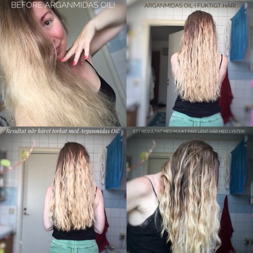 ❤️Älskar älskar denna fantastiska Arganmidas Moroccan Argan Oil! Måste säga att detta är en av mina favoriter, en verklig top oil serum som vårdar mitt hår, ger glans och reducerar frizzighet! Mitt hår är frizzigt, långt, tjockt med grova strån och lockar/självfall som alltid är beroende av bra produkter som levererar riktig omsorg av mitt hår! Oljan/serumet i en glasflaska med pump som gör det lätt att pumpa ut rätt mängd, oljan har en gulaktig, fin konsistens....lite tjockare men inte för tjock! Doftar ljuvligt underbart gott! Ingen dominerande som tar över men visst känner man den efter applicering både i håret och på hud! Men så himla fin!!! Precis vad jag önskar och tycker om...så fräscht! Jag brukar applicera i fuktigt hår och därefter en lös bun utan fäste virar jag in håret i min hårturban och låter det sitta så en stund...och därefter självtorka! Resultatet blir AMAZING😃😍! Mjukt, lent utan frizz och en fin lyster som får/gör håret att se så välmående ut! Oljan tränger in i stråna, lämnar inte någon klibbighet eller feelings av ”smörpaket”! Jag använder även oljan på min hud, framförallt armar, dekolletage samt benen...lämnar en snygg fin lyster....dock tänka på mängden så det inte blir för mycket! Superskön till både hud & hår! Denna oljan använder jag mest under sommartid men även på hösten behöver mitt hår en kurperiod av magi😍! Rekommmenderar denna oljan/serumet! En verklig investering till alla som älskar sitt hår! 😊Jag är grymt nöjd! #Tävling1 produkt i inlägget Älskar oljan & doften💕16434 visningar- Användarens roll: Lyko Creator.Kommentaren lades 4 år@Veronica Hej Veronica 😊! Jag brukar inte ta den i min hårbotten direkt utan jag tar det i håret sen kan det ju hamna lite av oljan på hårbotten. Har du mycket torr hårbotten så hade jag rådfrågat Lykos frisörer om råd o tips då det är svårt för mig att svara på din fråga, så du inte får någon irritation av produkten. Kram Aka1 gillar