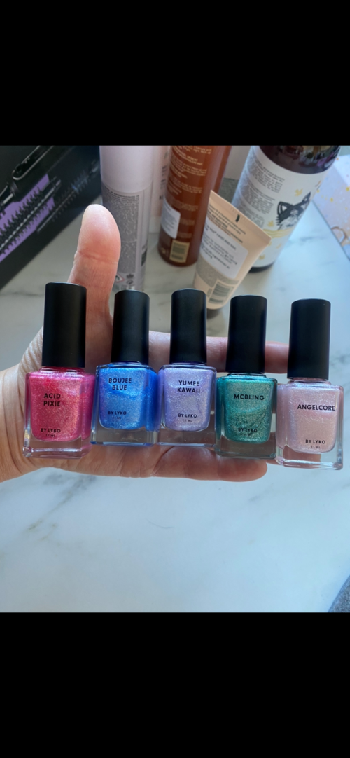 Direkt när jag såg detta kitet med fem lack, så tänkte jag: åh, vad fina! 🤩 Jag har inte direkt stor erfarenhet av lykos lack. Men jag vet nu att det blir absolut inte sista gången, som jag kommer köpa lykos lack. Angelcore fick jag tyvärr ingen bild på, då jag glömde fota det tidigare i veckan. Men det är rätt likt Yumme kawaii, fast lite mindre rosa/lila. Utan nästan mer silver. Jag har på fotona målat tre lager av alla lack. Penseln är bred, men inte för bred. Det gick jättesmidigt att måla pga penseln bredd. Lacket täcker inte 100%-igt vid tre lager, men jag tycker det blir fint ändå. ☺️ Man kan säkert lägga på ett fjärde lager, om man vill. Jag upplever att lacken är lite mer slittåligt än essence-lack, som jag använt mig mycket av. Detta är ett mycket prisvärt kit. Och det är som sagt inte sista gången jag kommer köpa lykos lack. #lykoreview