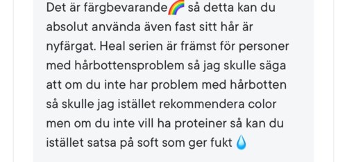 Hur fungerar denna på nyfärgat hår? Tänker om man kan lägga den innan eller efter hårfärgning? Samt torkar den ut något?1 produkt i inlägget Färgat hår?1479 visningar- Användarens roll: Tidigare anställd.Kommentaren lades 1 årHejsan Ella! 😍 Denna fungerar på nyfärgat hår, dock så finns det en risk att den kan dra ur färgen så jag skulle rekommendera att använda den innan du lägger en hårfärg för bästa resultat!! Nej, den torkar inte ur håret. Tvärt om! 😍 Ha det bäst! ❤️
