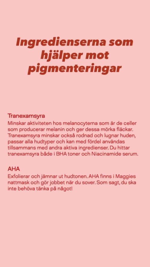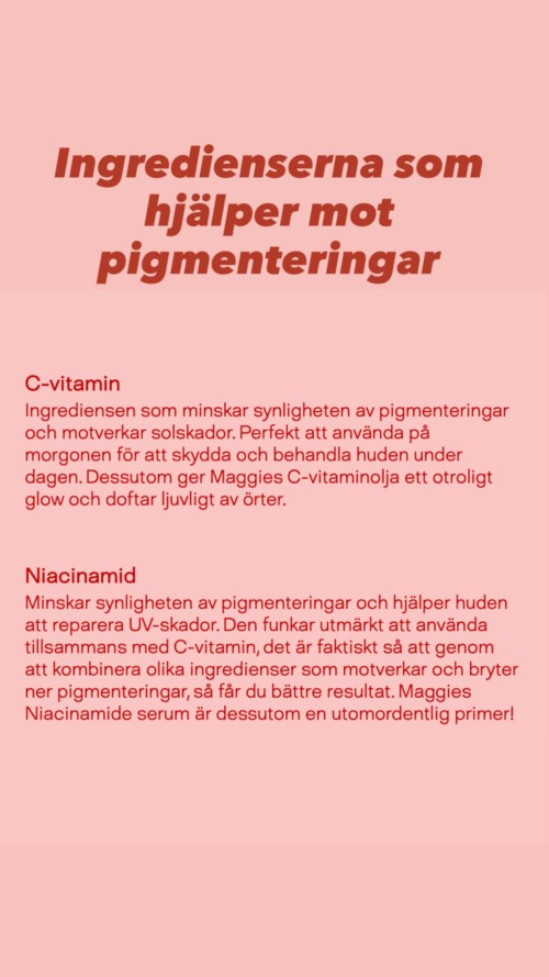 Har du fått pigmenteringar (mörka störiga fläckar) i sommar? Det är väldigt vanligt, även om du är noggrann med solskydd så tenderar solen att ta fram pigmentfläckar. Speciellt påverkar hormoner dessa solfläckar, om du är eller har varit gravid, ammar, går på något preventivmedel eller i värsta fall bara om du är ledsen. Och vem som drabbas verkar vara lite hugget som stucket. Vad kan du göra för att bli av med dem? Det finns flera ingredienser i Maggies hudvård som kan hjälpa till att göra dem mindre synliga. Som vanligt har vi tänkt på allt, du ska bara behöva smörja! Läs om ingredienserna och produkterna i bildserien!4 produkter i inlägget Pigmenteringar?242 visningar - Inlägget skapades 8 månader