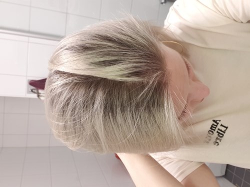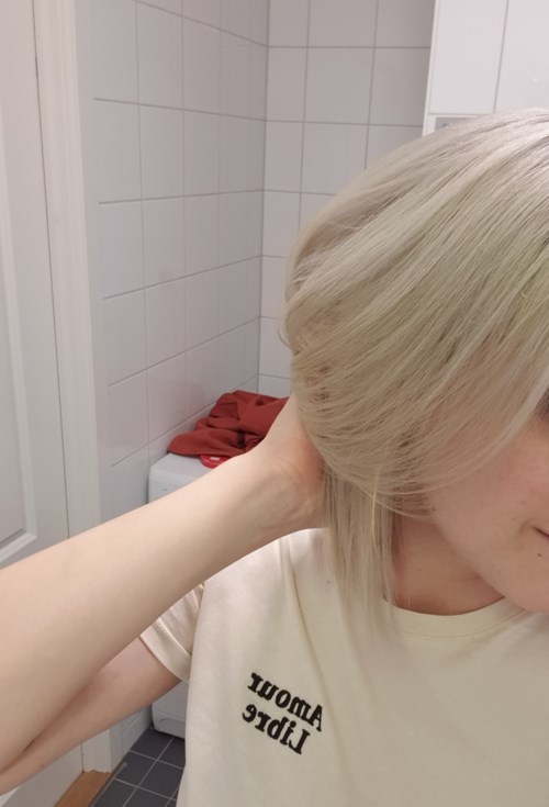 Körde detoxshampoo från lyko i mitt blonda hår så jag fick bort gröna och blåa rester från andra produkter. Hade i "Pearl silver" i fuktigt hår och kammade igenom. Jättenöjd! Luktar himmelskt _________________________________________________________ Sedan ville jag testa på "Peach: efter några veckor. La i två gånger pga att färgen blev för ljus och ojämn. Andra gången så tvättade jag ej med shampoo så det kan vara därför det inte blev lika jämnt på alla strån, men det var den effekten jag ville uppnå (blev som baylage/ombre effekt). Luktar gott, alla färgbomber har olika dofter verkar det som.