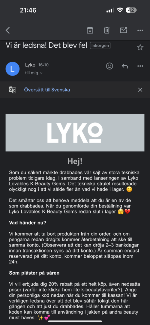 Detta är tredje gången sidan kraschar när jag försökt köpa en lyko lovabale. Det funkar aldrig. Hade larm hade den i varukorg och skulle betala stänger allt ner. Förra gången beställde jag produkten för att sedan få ett Mail att det blivit något fel och produkten ej kommer kunna levereras då den är slut i lager????? Hur kan det få fortsätta vara såhär1 produkt i inlägget Inte okej!322 visningar- Användarens roll: Kundtjänst på Lyko.Kommentaren lades 10 månaderJa jösses vilken fart det blev! Denna box fanns i en begränsad upplaga (ca 1400 st.), och när den släpptes var över 5000 shoppingsugna redo vid det digitala låset! Det höga trycket gjorde att sajten tillfälligt svajade för vissa, men boxen försvann ändå i rekordfart. Förstår verkligen att det känns snopet om du var på plats i tid men ändå missade den. Men håll utkik – fler spännande släpp väntar framöver! 💖