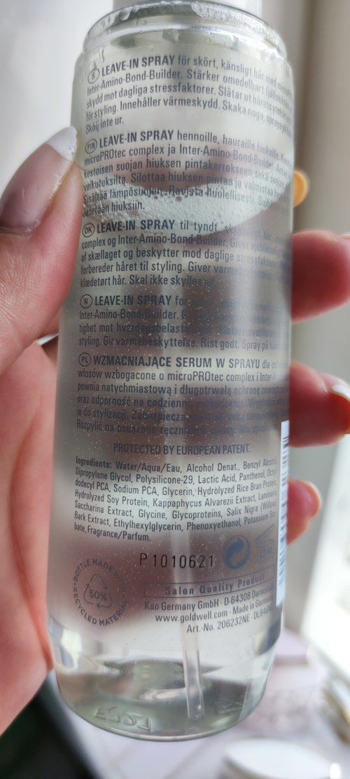 LEAVE-IN SPRAY för skört, ömtåligt hår med microPROtec complex och Inter-Amino-Bond-Builder. Ger omedelbart långvarigt skydd och reducerar påverkan från dagliga stressfaktorer. Jämnar ut ytskiktet och förbereder håret för styling. Ger värmeskydd. Perfekt även för fint, känsligt hår.