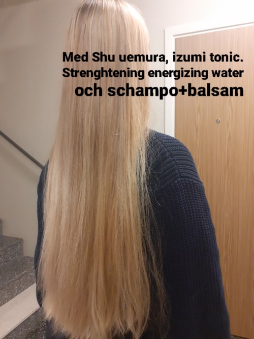 Mitt hår är riktigt långt och består av många tunna till lite medeltjocka hårstrån. Håret har blekta slingor och behöver därför både stärkas och fukt. Har endel fall i håret och strävar som på bilderna oftast få ett så rakt och platt hår som möjligt. Har ett extra starkt intresse av just hårprodukter sen många år och är generös med hårvård till mitt hår. Har använt flertalet olika slags stärkande produkter för håret tidigare. Har som rutin att växla med stärkande och fuktgivande hårvård varannan tvätt. Ibland använder jsg detox-schampon. Sprayen lovar att stärka håret och är inspirerad från japansk tradition av att skölja håret i risvatten för att få vackert hår. Jag hade nyligen fått Shu uemura fuktgivande hårmask i födelsedagspresent och hade sett det intressanta märket tidigare innan testet av hårprodukterna. Flaskan och hela serien Izumi tonic har en snygg stilren design. Sprayen har en lyxig doft som jag tycker om. Doften är åt det unisexiga hållet och skulle kunna vara en parfym från ett premium märka. Den är lite kryddig och blommig men också såpass fräsch att den inte blir tung. Doften är lagom stark och känns mest när man stoppar näsan i håret under användningen, men precis när jag sprayat så är doften såklart starkare. Kan berätts att Moisturizing serien från Shu uemura har en helt annan mild doft, så olika serier har olika dofter. En produkt med protein ger håret en torrare effekt än fuktgivande produkter. På endel ställen när jag läst runt om sprayen så rekommenderas det att också använda olja i håret samma märke. Jag som har så långt hår som lätt tovar sig vid tvätt behöver ha i en detangler direkt för att smidigt reda ut håret och inte hår ska skadas, vilket jag oftast behöver för få leave-in produkter har alla effekter jag behöver. Vi har ju olika hår och smak och därav behov. Så en produkt med en effekt och som gör den effekten bra är ju smart, för den passar ju flera. Jag gillar den här sprayen, den har en ovanligt bra spray-funktion med bra spridning. Den doftar gott och det finns andra leave-in sprayer som endast ska stärka håret och inte ge fukt som jag använt tidigare. Så dem jämför jag nu med och då är den här bäst, den här sprayen gör inte håret så hårt och stelt som liknande sprayer gör! 👌 Den är ultlmat för att spraya på håret för att stärka håret ihop med andra produkter. Den tynger absolut inte ned håret. En höjdare för alla som vill ha volym och stärka håret samtidigt! #LYKOINFLUTESTER #SHUUEMURA