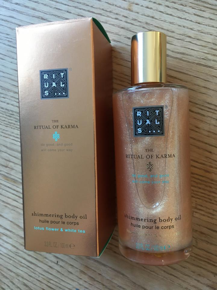The Ritual of Karma Shimmering Body Oil har jag nu fått testa i uppdrag som Lykoinflutester. Detta är en av 3 produkter från Karma serien som jag testar denna gång. Och denna Oil har blivit snabbt en favorit! Mitt först intryck... älskar😊! Jag är så förtjust i skimmer glitter överlag så denna blev snabbt en älskling! Glasflaskan är så otroligt snygg enkel med guldiga skruvkorken! Känns lyxigt och fräscht! Att se oljan med det vackra skimmer är lockande och vackert! Att tänka på skaka flaskan innan användning! Oljan doftar ljuvligt gott av vitt te och lotusblomma och sitter kvar länge på huden precis som skimret gör! Den är lättflytande och smidigt skaka/hälla ut från flaskan, skön att massera in....lägger sig så snyggt med ett vackert glitter av pärlskimrande mineralpartiklar. Så fin lyster! Lite festlighet i vardagen! Toppenfin vid alla tillfällen! Helt underbar och dryg... härligt...vill inte vara utan den😍! Det blir fortsatta köp...många😊! #LYKOINFLUTESTER #RITUALS #KARMA