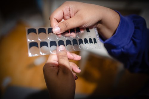 För att fästa Layern på nageln placera den på nagelbädden, börja fästa layern på ena sidan, närmast nagelbandet och tryck ut till motsvarande sida. Fortsätt mot tippen. För bästa resultat - placera Layern noggrant på din nagel så att den appliceras på själva nagelbädden och inte huden, och att dess kanter ligger tätt mot, men ej på, ditt nagelband - våra Layers är töjbara och kan sträckas ut för optimal täckning.