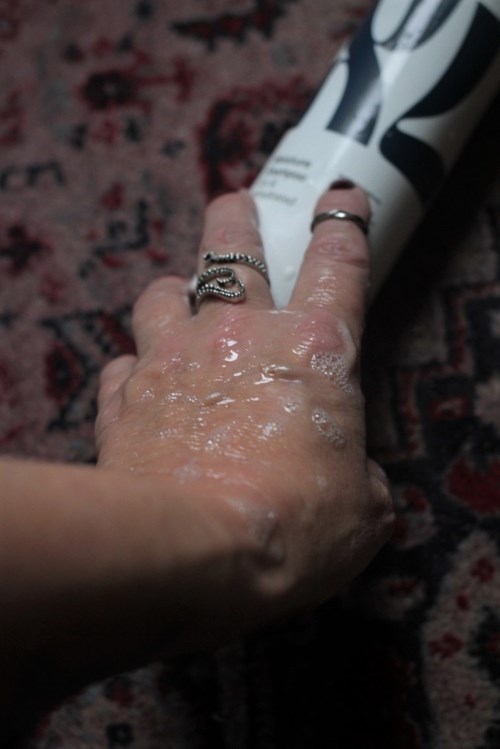 Massera in i vått hår, skapa ett lödder. Skölj väl.